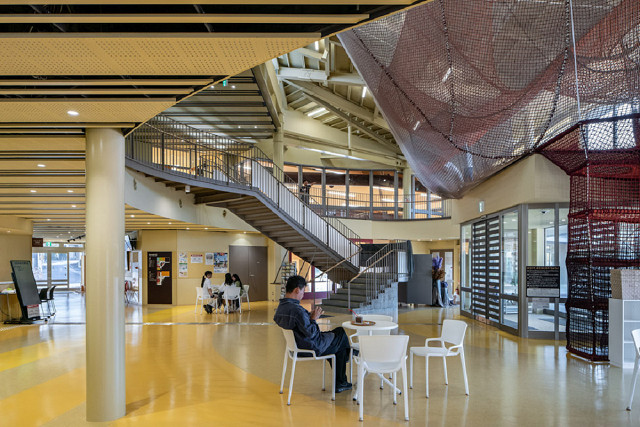 まちの通りをつなぐ南北と東西に大通りを設け、その交点に、広場とエントランスホールを配置した。エントランスホールを囲むように、多目的ホール、調理室、会議室、カフェなどが放射状に配置され、どこからでも館内の様子が垣間見え、多世代の交流、憩いの場を形成している。